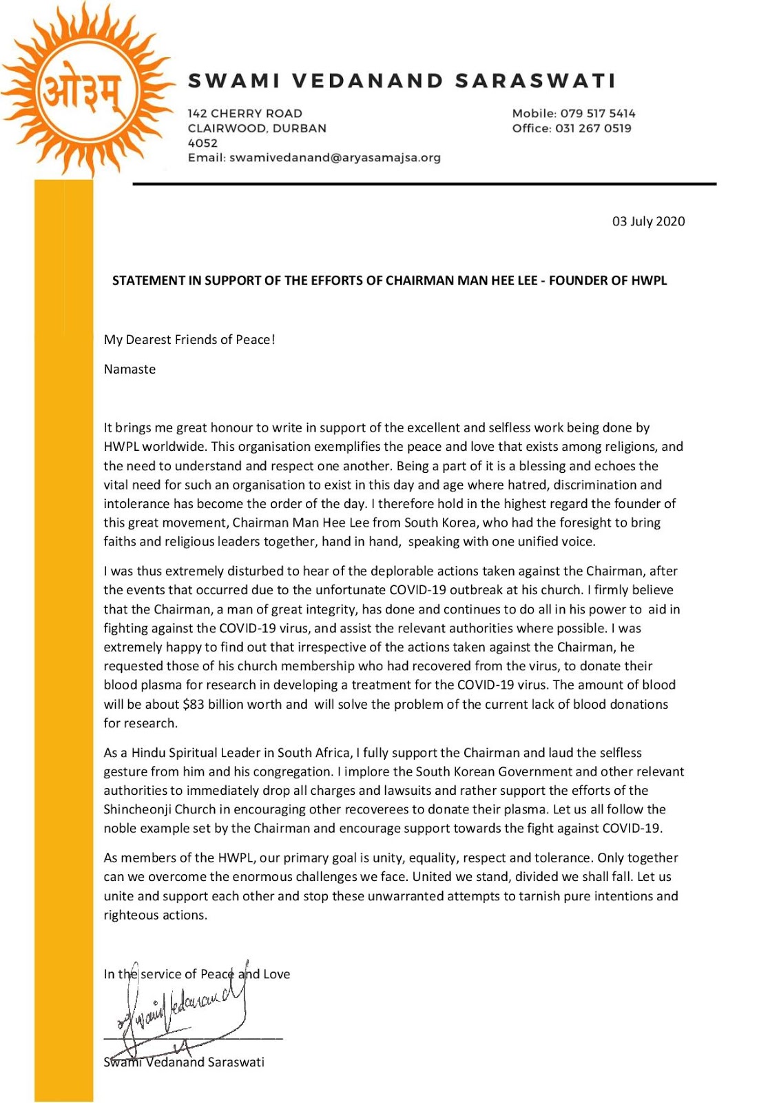 Bezüglich der exzessiven Schuldzuweisungen gegenüber der Shincheonji-Kirche betonte Swami Vedanand Saraswati, der hinduistische Leiter von Arya Samaj in Südafrika in einer schriftlichen Erklärung, dass man die diskriminierenden Handlungen gegenüber dieser religiösen Gruppe stoppen sollte: „Ich fordere die südkoreanische Regierung und andere beteiligte Behörden dazu auf, unverzüglich alle Anklagen und Gerichtsverfahren fallen zu lassen und sich stattdessen an den Bemühungen der Shincheonji-Kirche zu beteiligen, um auch andere Meschen zur Plasmaspende zu ermutigen. Lasst uns alle dem edlen Beispiel des Vorsitzenden folgen und zur Unterstützung des Kampfes gegen COVID-19 aufrufen”.
